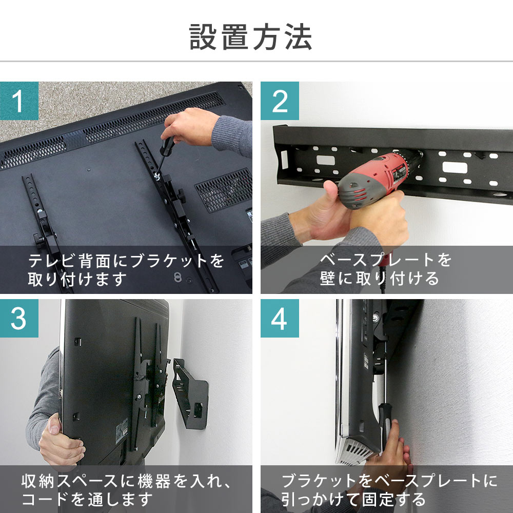 テレビの設置条件と異なる設置による事故・故障等の保証はございませんので、施工前にテレビ、及び商品の説明書をよくご確認ください。