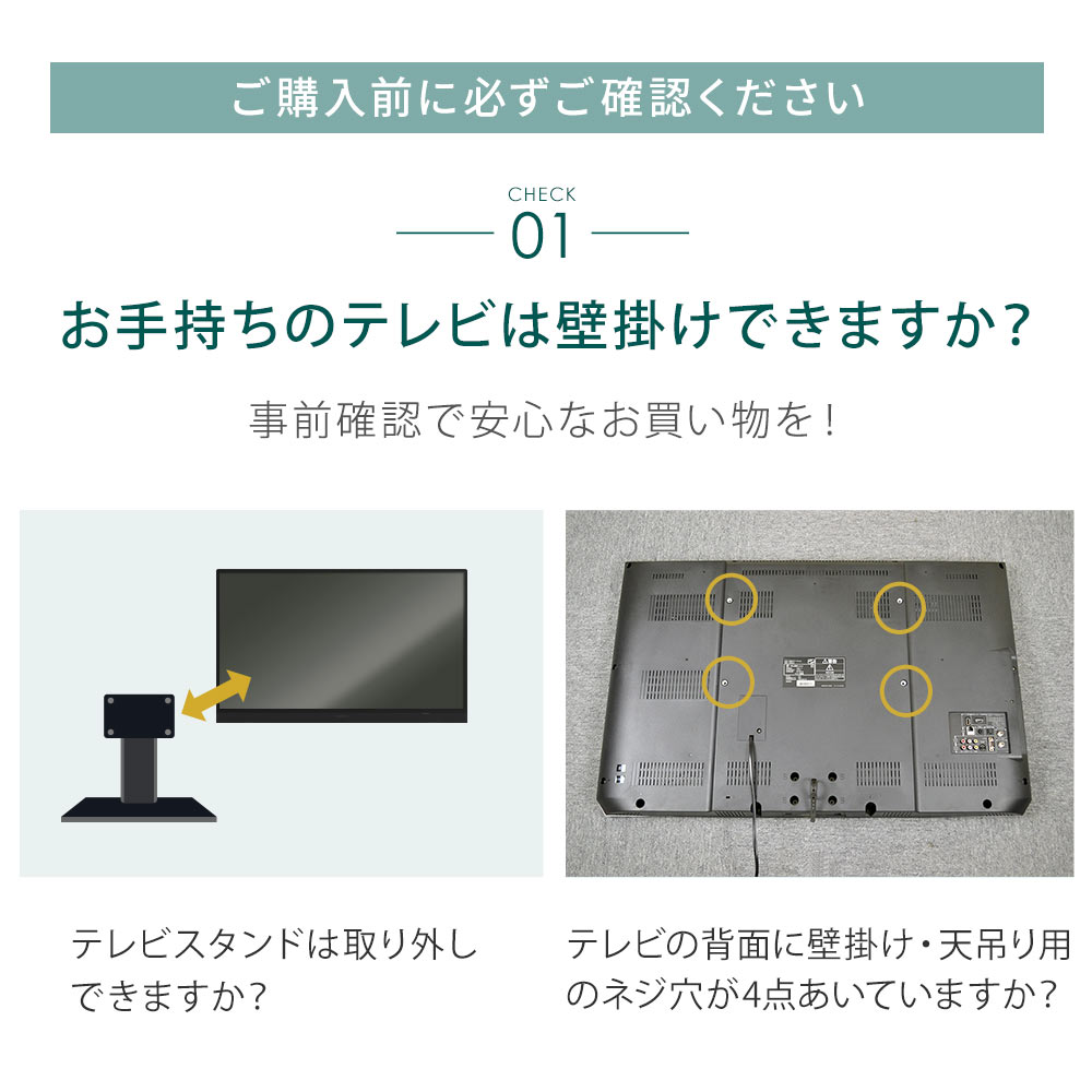 ・テレビ背面にネジ穴があいている事 ・テレビ背面がフラットである事 ・テレビサイズが37~75インチである事 ・テレビ重量が30kg以下である事 ・テレビ背面のネジ穴の間隔が「縦:100~400mm 横:200~600mm」の範囲内ある事 |